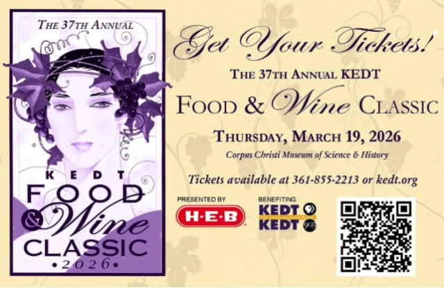 2026 KEDT Food & Wine Classic THUSDAY, MARCH 19 @ 7pm Corpus Christi Museum of Science & History - 1900 N. Chaparral During this community-favorite event, guests can tour wine-tasting stations while sampling cuisine from some of the area’s finest restaurants, caterers, dessert makers and bakers!